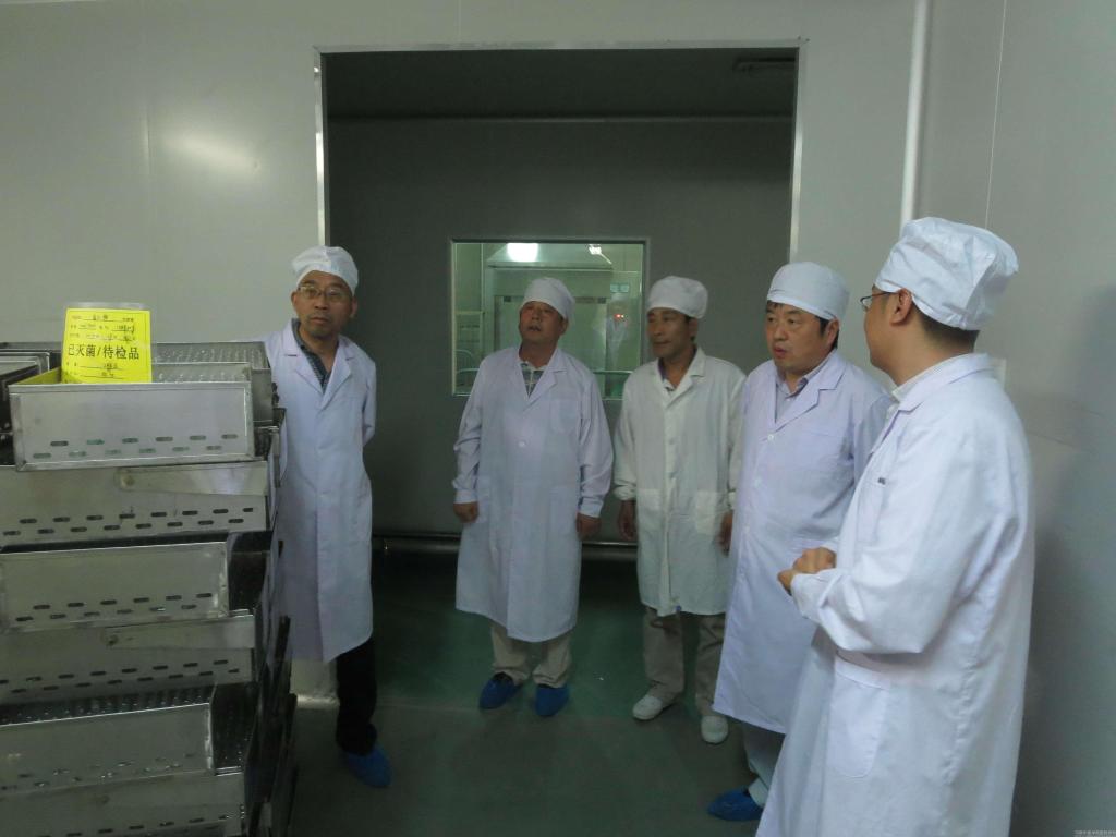 领导一行在百正药业常务副总经理唐永(右一)的陪同下参观生产车间