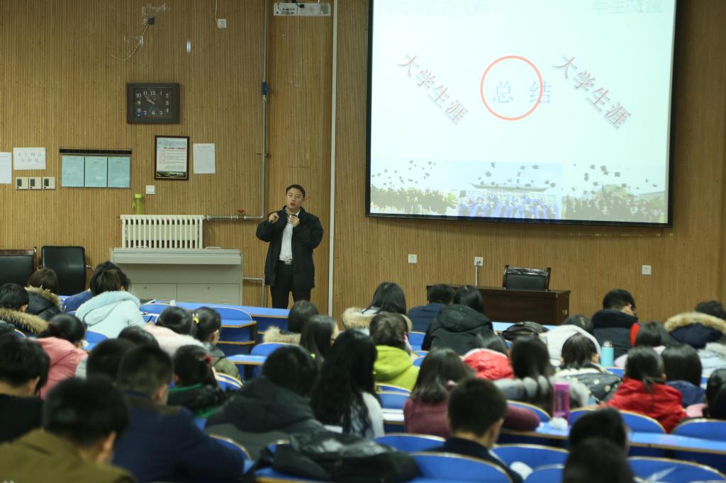 党委副书记杨文胜老师对实习过程中的重要时间节点作出具体安排,指出毕业生在实习中可能出现的问题并提出具体的解决方案,杨书记特别强调了国家的就业形势、“三支一扶”、援疆援藏、提前还贷的优惠条件以及实习纪律,希望同学们遵守实习单位和学校的相关规定,注意实习就业过程中的防骗和人身安全,圆满完成实习任务。接着,王一硕老师对相关实习材料做出具体规范,对2017年毕业论文重复率筛查、国家毕业论文抽查、毕业答辩新政策做出特别强调,鼓励同学们在实习中及时更新知识,保证自身安全,坚守实习岗位,做到多思多问。最后由学科老师从专业角度为同学们进行毕业论文指导,老师们分别从论文选题、撰写和答辩三方面详细介绍了毕业论文的要求,提供行之有效的方法。