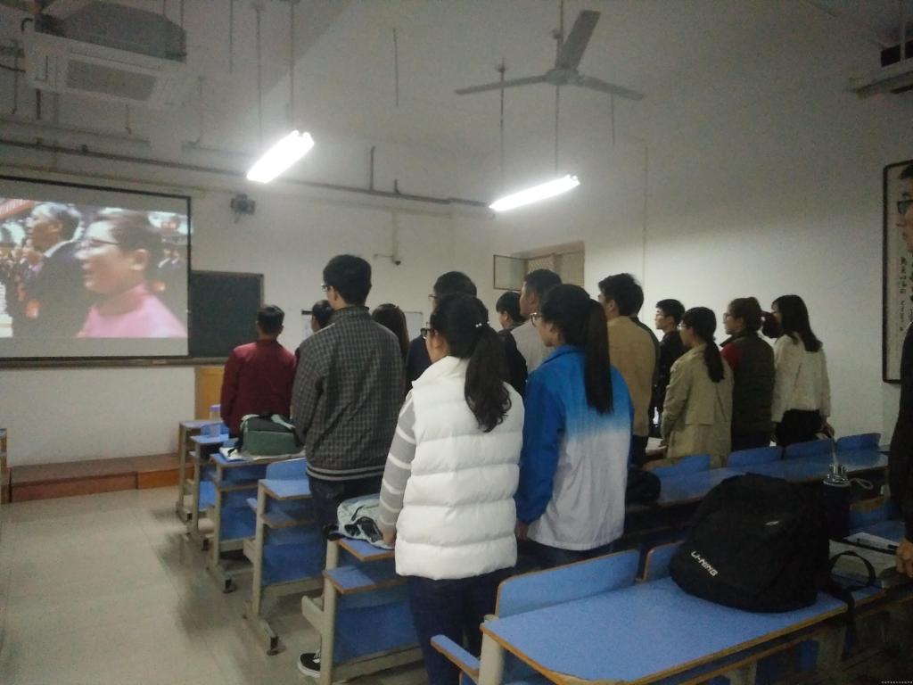 师生党员全体起立迎接十九大开幕式的胜利召开