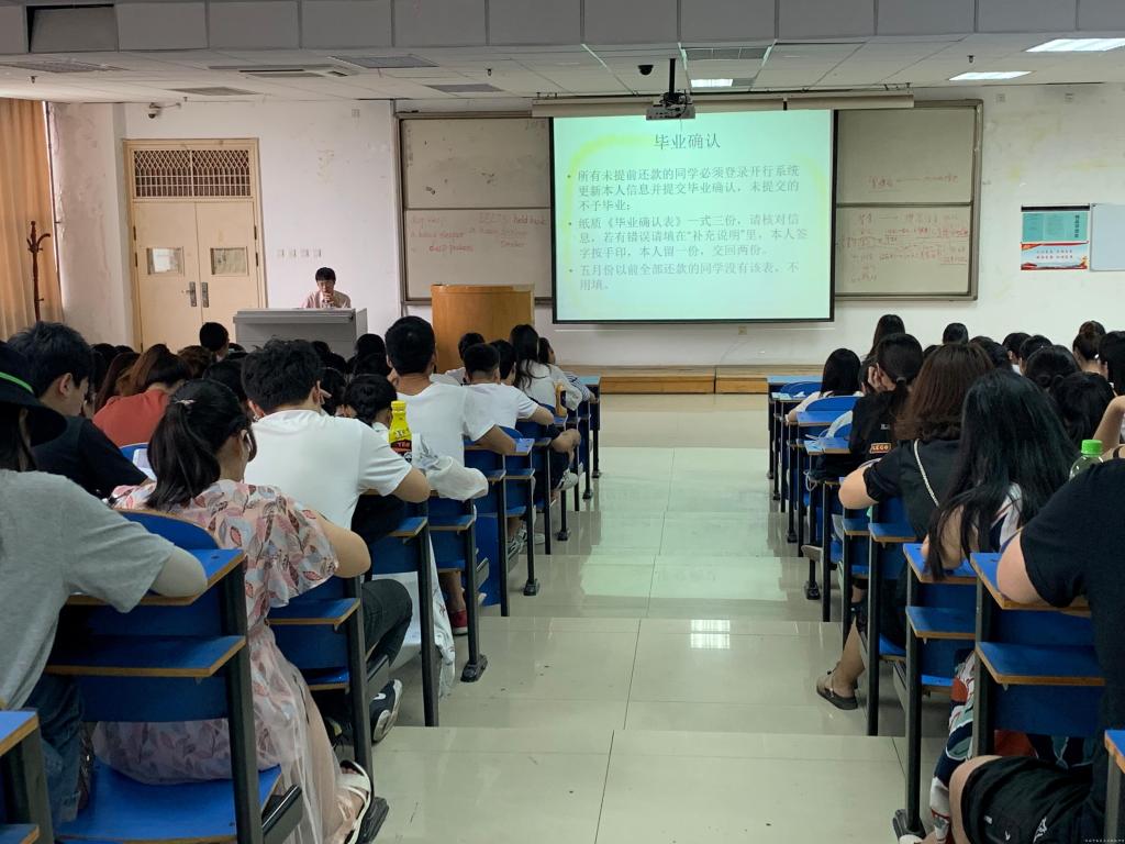 资助专员刘炳,学贷专员郝悦,毕业班辅导员武永勇以及2019届全体毕业生参加了此次班会,刘炳老师担任主讲人。