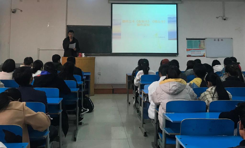 资助专员刘炳老师主持说明会。会上,刘炳老师首先介绍了《告知书》寄送、张贴的流程,并强调了转交第一书记的重要性。其次,要求每位建档立卡学生准确填写家庭信息并在邮寄前及时通过电话同家长联系,并就《明白卡》和《告知书》情况进行说明,确保每位建档立卡学生家长了解《明白卡》和《告知书》的用途。最后,刘炳老师对建档立卡学生提出的问题进行现场答疑。