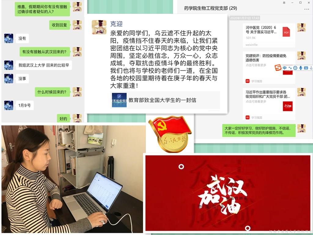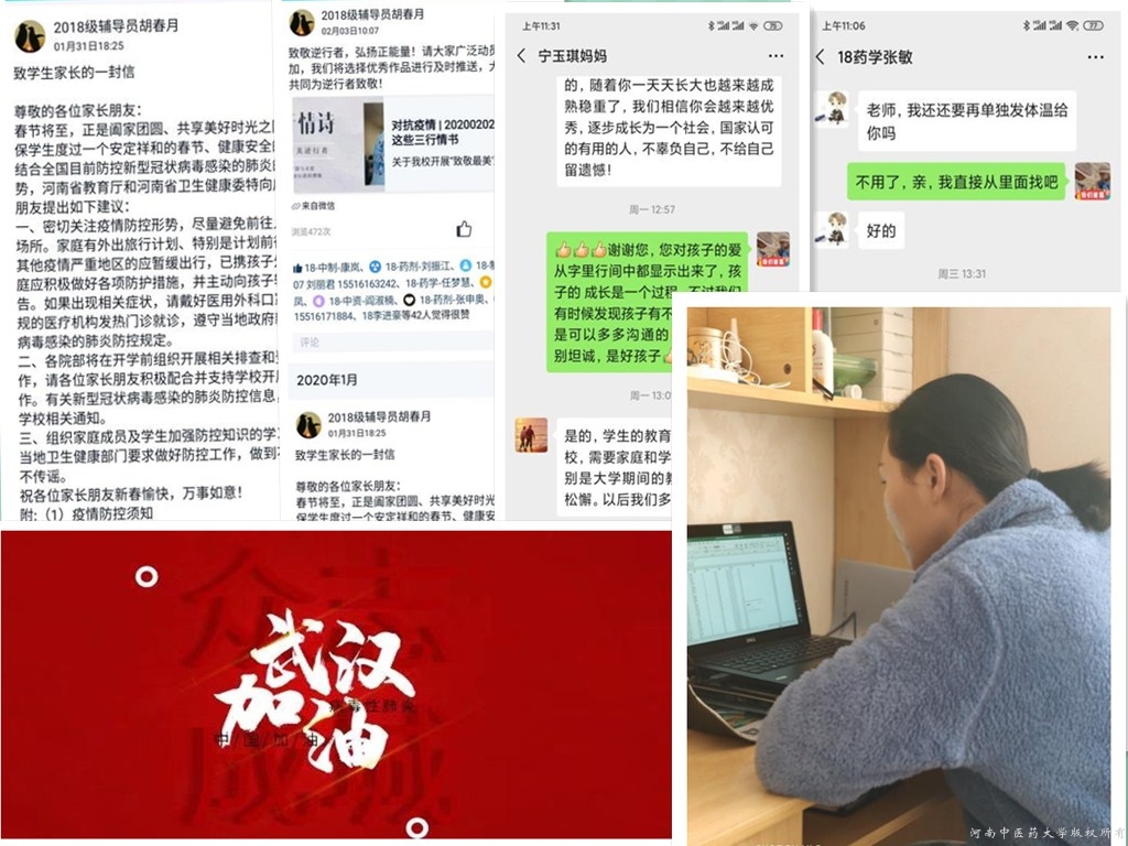 辅导员高巍每日必做的事情。她是几千名学生的老师,也是一位母亲。虽要照顾年幼的孩子,但仍旧按时完成上级交付的各项工作任务,落实学校疫情防控方案。同样带娃工作两不误的还有辅导员武永勇。他通过QQ群,电话等方式全面掌握学生动态,准确及时传达信息。她人在家,心却牵挂着学生们,辅导员克迎迎发挥学生党员的先锋模范作用,动员学生党支部的成员做好防护措施。疫情来临,各种问题也随之而来。辅导员胡春月建立家校合作机制,全天在线解答学生的疑问,全力做好服务保障工作。疫情之下,齐心协力是关键。辅导员王超提醒同学们要按照国家要求和当地政府、社区的统一规定做好防范,增强大局意识。辅导员李旭宁参与学生心理方面工作,与心理部共同为学生提供心理健康指导与心理疏导,引导学生正确对待疫情。高效工作是做好防疫工作的关键。辅导员张田丽总会在第一时间向学生传达学校通知,将"上情下达、下情上传"做实,做透。疫情来临,辅导员郝悦建议学生在家也要不断学习,锻炼身体,保持良好心态。组织高效,才能打胜仗。辅导员刘炳把学生干部充分动员起来,带动学生共同抗疫。从春节模式快速转入战疫模式的辅导员朱会宇,绷紧每根神经,牵挂每名学生,用实际行动支持着国家打赢防控阻击战。