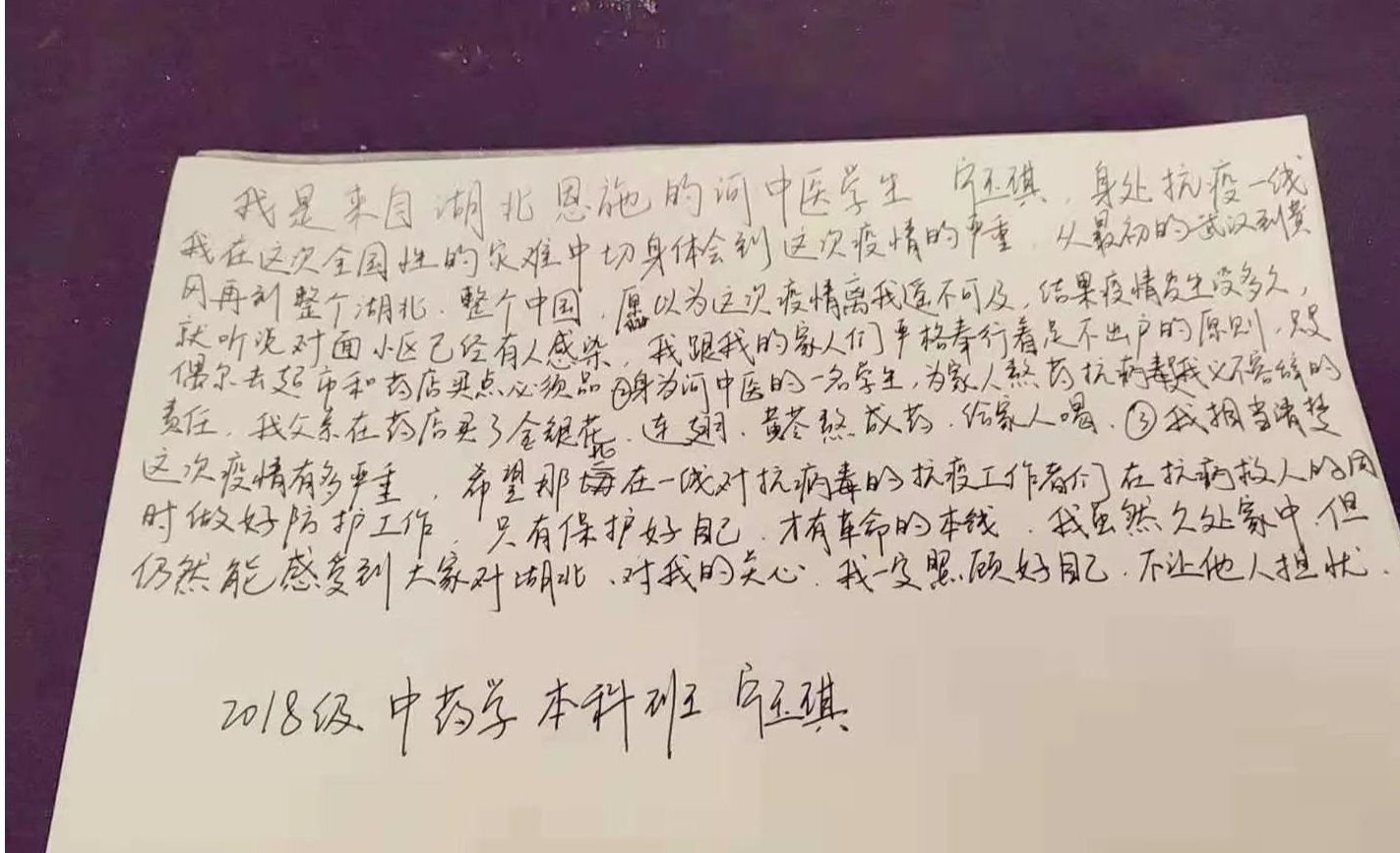 学生的配合与奉献精神值得我们大家学习。2018级中药制药本科班蒋维鑫同学说每一位在疫情中配合工作的人,都值得我们学习,值得我们鼓掌。宣好誓的“健康所系,生命相托”的河中医青年,虽然无法站在第一线,但他也用行动证明了“战疫”的决心。2018级中药学本科班宁玉琪同学说,只有保护好自己才是革命的本钱。疫情中,他们一家秉承“足不出户”的原则,挂念着前线的医护人员。身为药苑学子,她在疫情中用自己的知识保护着自己、保护着家人。身为湖北人民,她积极配合防疫工作,用行动表明抗疫之心。
