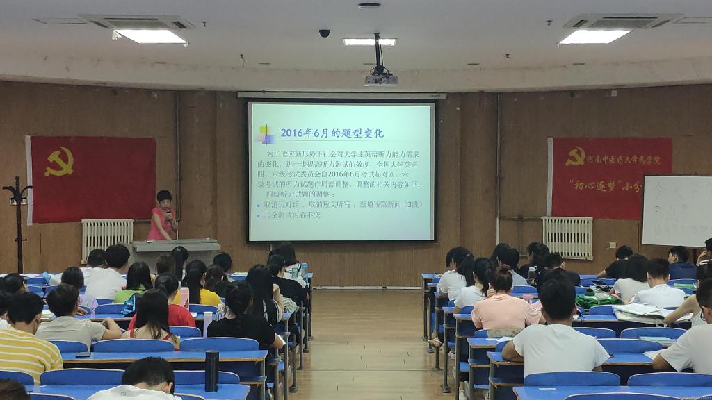 (文:克迎迎,图:汪纪奥)为了激发同学们学习英语的热情,备战即将到来的四六级考试,2019年6月12日,*七猫小说 邀请外语学院的任灵玲副教授于三楼多功能厅作了题为《CET-4&CET-6题型分析及应对策略》的专题讲座,*七猫小说 分团委副书记克迎迎及“初心逐梦”小分队成员聆听了此次讲座。