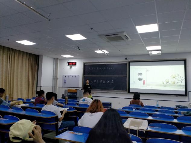 首先,书画部何美莲同学为大家讲解了隶书的运笔、行笔等书写技巧。何美莲同学结合自身练习隶书的体会和经验总结跟大家交流心得,分享了一些练习隶书可能会出现的误区,提醒大家在日常练习时的注意事项。最后,何美莲同学还为大家展示了几幅著名的隶书碑文图片,同学们在书画部的指导下认真练习隶书基本笔法。