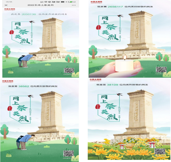 “山河虽无恙,吾辈当自强。”活动中,我院研究生自发登录“中华英烈网”,通过向烈士敬献花篮、祭扫烈士陵园、瞻仰革命烈士纪念碑、查阅学习英烈纪念馆中的英烈事迹、发表感言等形式,缅怀英烈,致敬英雄,寄托哀思,短短几个小时参与人数就超过100人。