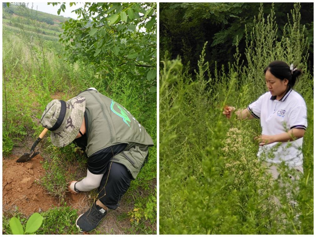 小分队研究生在君王村中药材基地进行土质和药材样品采样以及辨药识药劳动实践