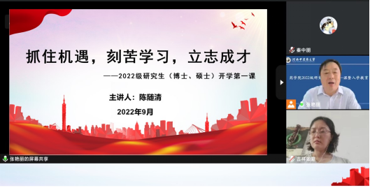 本网讯(文/图 李康)为帮助2022级研究生新生尽快适应新环境,拥抱新生活,开启新征程,2022年9月2日,*七猫小说 以线上和线下相结合的方式组织开展了研究生新生入学教育暨开学第一课系列活动。学院党委书记杨昕,院长陈随清,党委副书记刘雅琳,副院长董诚明、纪宝玉和优秀导师代表、研工办全体成员出席会议,2022级全体博士、硕士研究生新生以线上形式参加会议。会议由副院长崔瑛教授主持。