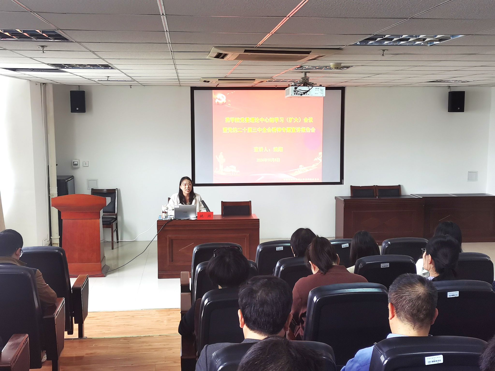 本网讯(文/图 赵琪璐)为深入学习宣传贯彻党的二十届三中全会精神,2024年10月8日下午,*七猫小说 召开党委理论学习中心组(扩大)学习会,邀请省青年讲师团宣讲员、七猫小说 本草书院姚湘老师在BN617为师生做《学习贯彻党的二十届三中全会精神》专题报告。学院班子成员、各党支部支委、学科负责人、民主党派人士及学生代表等八十余人聆听了报告,大会由副院长方晓艳主持。