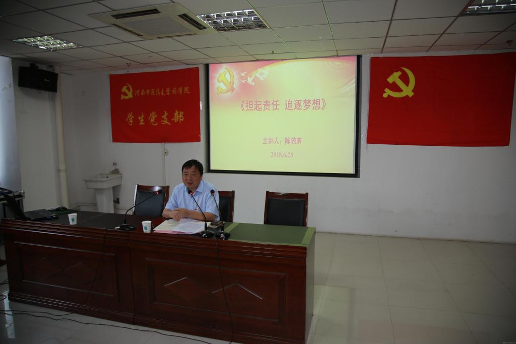 会上,陈书记首先向大家详细解读了“梦想和责任”,每个人都有自己的梦想,想要实现这些梦想需要大家真正的担起自己的责任。第一,作为社会大集体中的一员,我们都有赡养父母、培育子女、回馈社会的责任。每学年的敬老孝亲报告会、社会实践不仅是让同学们参加个活动,更重要的是提高大家的责任意识,向抚养我们的家人、关爱我们的社会回馈真心。第二,作为一名大学生,同学们需要学习知识,增长才干,努力成为社会主义事业的建设者和接班人。药学人肩负重任,药品质量不过关、药品造假等都是关乎人民生命和健康的大事。扎实的学业知识、牢固的专业基础不仅是高校培养优秀学生的基础,更是同学们以后走上工作岗位的基石。同时大学生思维活跃,勇于接受新鲜事物,但是一定要明辨社会上的不良风气。我国有非常优秀的传统文化和铁骨铮铮的奋进历史,这些才是大学生作为优秀文化倡导者所应该提倡的。第三,作为一名党员,八项义务就是我们的责任。同学们应该积极学习党的知识,贯彻执行党的基本路线和各项方针、政策,坚持党和人民的利益高于一切,自觉遵守党的纪律,维护党的团结和统一,切实开展批评和自我批评,密切联系群众,发扬社会主义新风尚,努力提高为人民服务的本领。接着,陈书记带领在座党员一起学习了习近平总书记在2018年5月2日视察北京大学时的重要讲话。希望同学们要深刻体会习总书记对青年学生的殷切期望,在马克思主义和习近平新时代中国特色社会主义思想的指引下,砥砺前行,争做时代的弄潮儿。最后,为纪念中国共产党97岁生日,继承党的光荣传统,全体党员面对党旗重温入党誓词,铿锵有力的声音传达了身为共产党员的自豪感与使命感,重温入党誓词也使全体党员受到了一次心灵的洗礼和思想的震撼。
