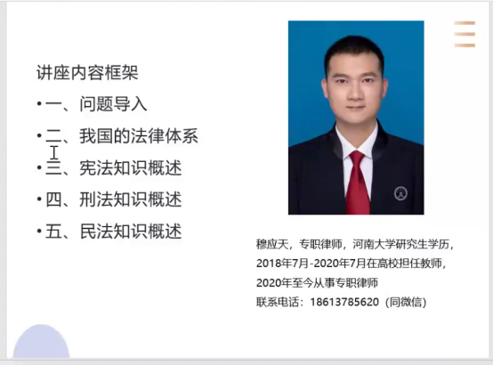 本网讯(文/图 李康)为筑牢我院研究生群体法治意识,提升大学生法治素养,营造文明、平安、和谐的校园环境,2022年4月21日,*七猫小说 组织研究生代表参加了以“法在身边——做知法懂法守法的大学生”为主题的大学生普法教育讲座。本次讲座由穆应天专职律师主讲,*七猫小说 博士、硕士研究生以腾讯会议的形式参与线上讲座。