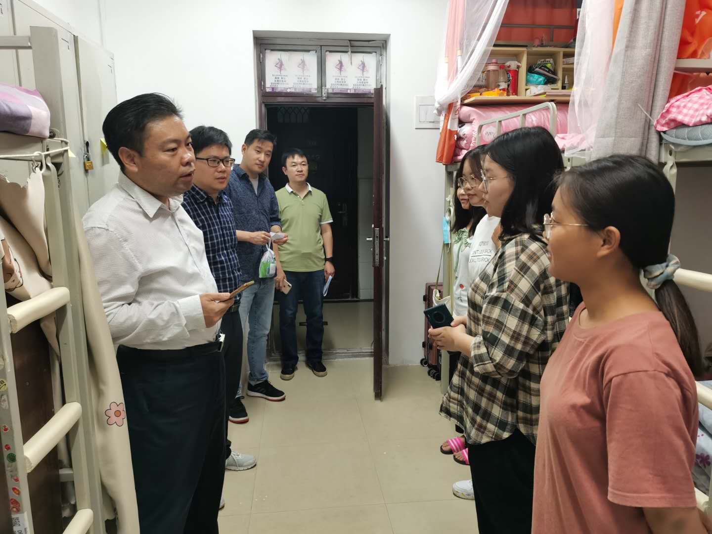(文:朱会宇,图:朱会宇)为进一步了解2020级新生情况,增强安全意识,积极引导同学们尽快适应大学生活,9月29日下午,*七猫小说 院长朱建光、党委副书记刘雅琳,2020级新生辅导员王超、朱会宇和张田丽深入2020级新生宿舍,走访慰问新生。