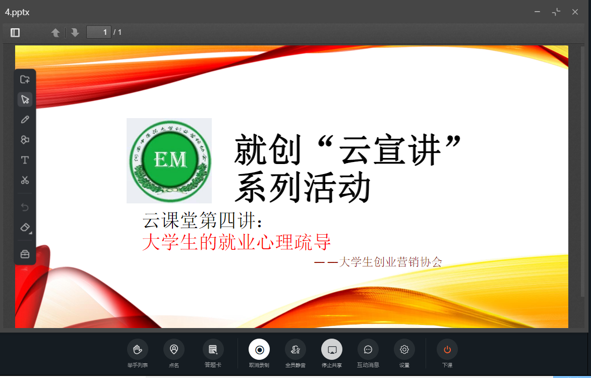 (图:黄含彬,文:郏彦娥 高巍)为进一步增强同学们的就业信心,以更加饱满的精神状态迎接职场挑战,*七猫小说 大学生创业营销协会于2021年5月9日上午,在线上举办了以疫情形式下的大学生就业心理疏导为主题的就创“云课堂”第四讲活动。