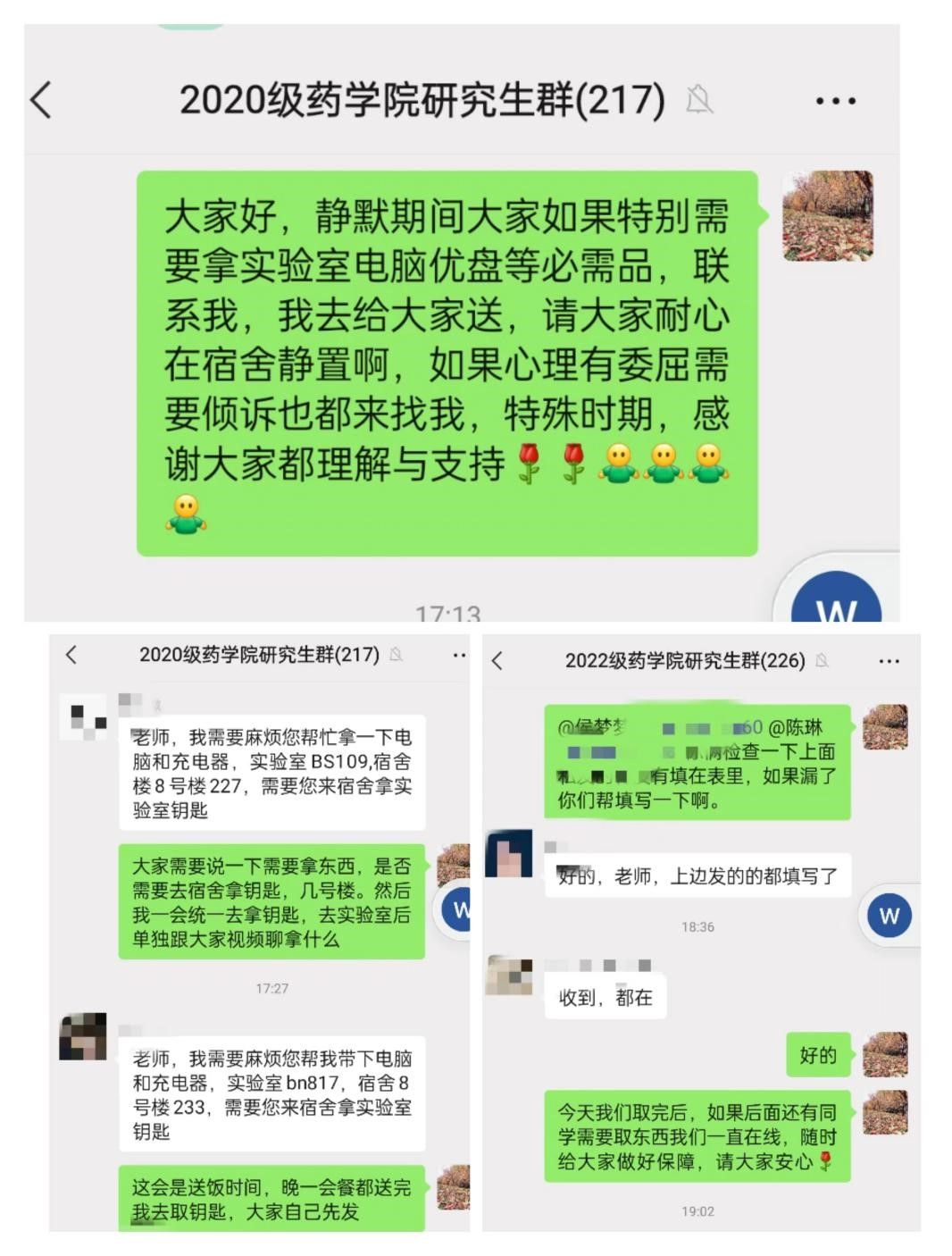 他们是使命必达的“宅急送”。11月9日深夜,学校龙子湖校区紧急实施最严格静默管理,全体学生足不出宿舍,但大家的科研和学习物品并未来得及从实验室带回,很多高年级研究生毕业班同学犯了愁。“同学们,谁的电脑、实验记录本等学习和生活用品在实验室,需要代拿的给辅导员老师说”“老师,我父母给我带的被子和棉衣在北门,你能帮我带到宿舍吗”“老师,我的实验细胞在北门,你方便帮我带到实验室吗”。针对研究生的多样化个性化需求,两位辅导员老师立即化身使命必达的“宅急送”,一方面积极安抚同学们的焦虑情绪,另一方面精准统计同学们需要的科研学习用品,并立即分两批次逐层逐实验室为同学们查找取回笔记本电脑、学习课本、实验记录本等76件物品和实验数据,并及时进行了“一对一”物品标签登记和逐人分发到位;除此之外,两位老师还化身送餐员和配送员,静态管理期间为同学们“北门——宿舍门口”往返送餐、取送棉衣棉被、生活用品和实验耗材近30余次,定期将学校发放的生活必需品、防疫物资、中药汤药等分批次配送给同学们。对于个别研究生的紧急就医需求,两位辅导员老师更是会想方设法帮助同学们联络安全外出就医并顺利返校静置,积极解决同学们的急难愁盼需求,用辅导员的忙碌和担当换来了同学们的安心和健康。