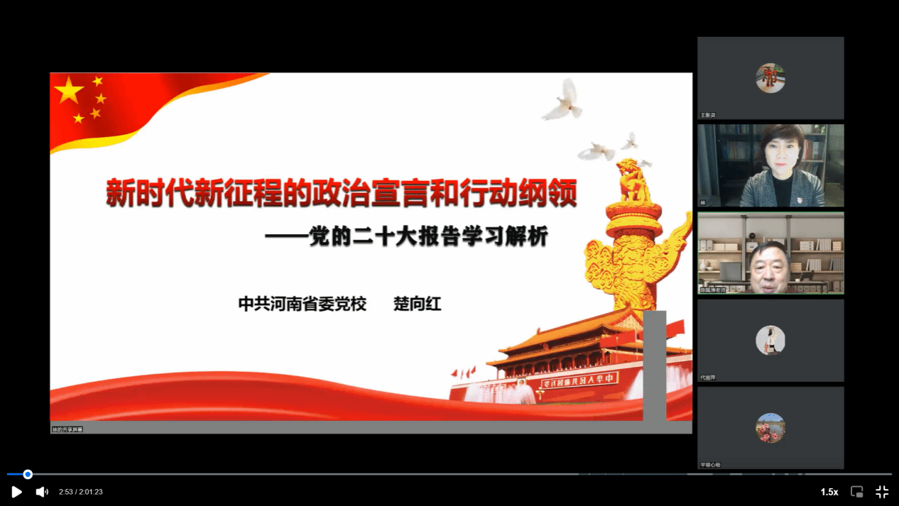 本次会议邀请了中共河南省委党校楚向红老师做专题报告,楚老师以《新时代新征程的政治宣言和行动纲领》为题,结合习近平总书记提出的“五个牢牢把握”,对党的二十大报告从五个部分十五个方面进行了详细解析,对参会老师学懂弄通做实党的二十大精神既是一次很好的辅导,也是一次有力的推动。