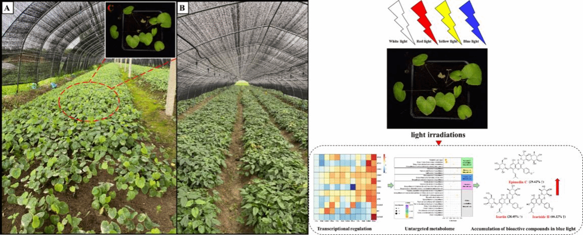 箭叶淫羊藿为中国药典中药材淫羊藿的基原植物之一,为河南省道地药材目录(第一批)收录品种,作为一种典型的阴生植物,箭叶淫羊藿在不同光照条件下具有典型的次生代谢过程。该研究揭示了箭叶淫羊藿在红光、黄光和蓝光照射下的代谢过程,揭示了蓝光对箭叶淫羊藿黄酮类化合物生物合成的机制,发现可以通过蓝光或蓝膜覆盖来改善光照条件,从而促进箭叶淫羊藿生态栽培过程中淫羊藿苷的积累,为箭叶淫羊藿生态种植中光控措施的应用起到指导作用。