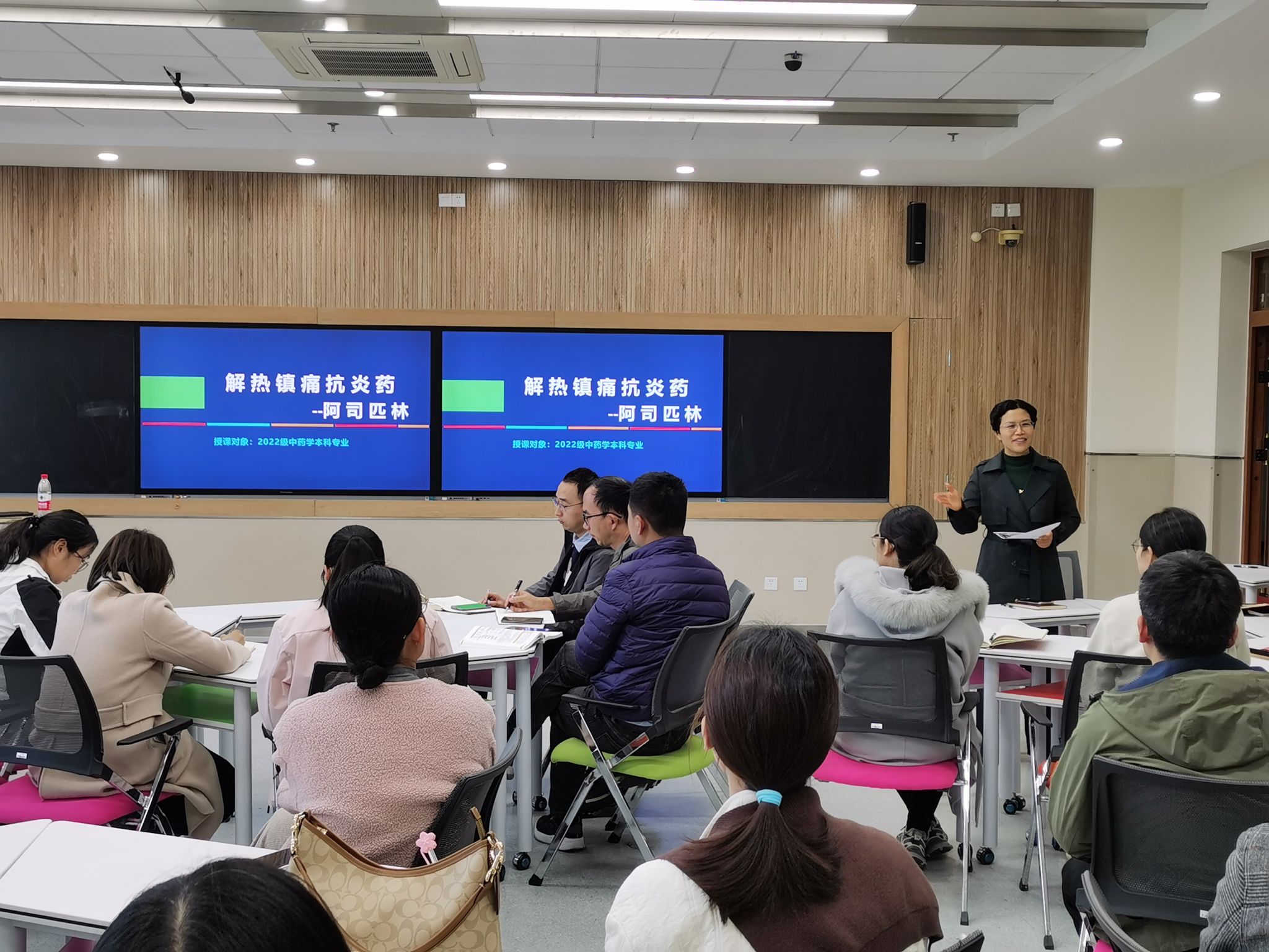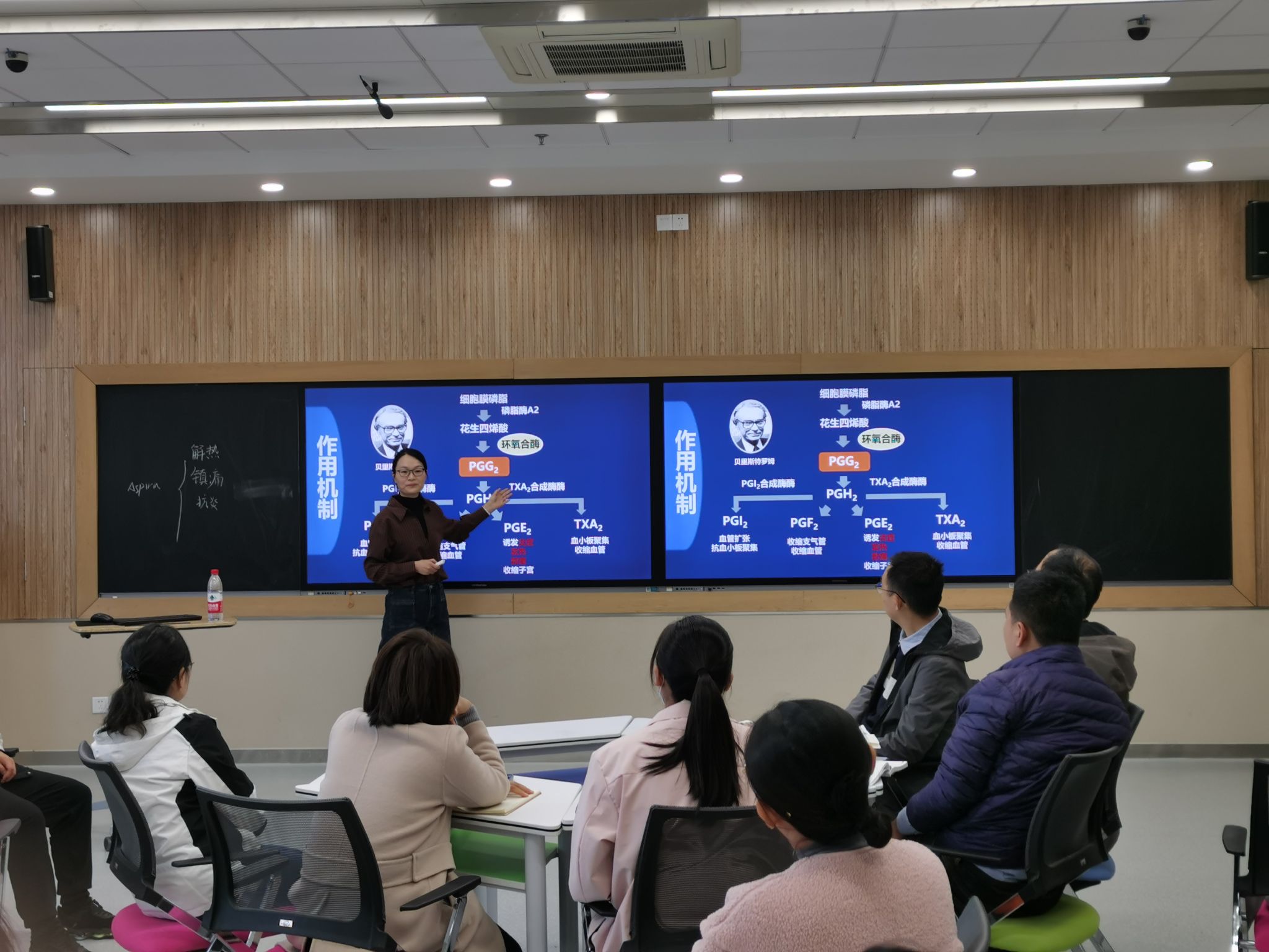 河南省优秀教学标兵、河南省本科高校课程思政样板课程《药理学》团队骨干成员、青年教师付俊敏博士进行了《药理学》解热镇痛抗炎药章节阿司匹林的示范教学。付老师依托课程教学内容,从药理学的学科特点出发,结合“课程思政”教学改革的育人目标精心准备教学内容,以“模拟场景”导入课题,巧妙设计教学环节,融入课程蕴含的思想政治教育元素,课堂不仅充满了趣味性,还展现了高阶性,展示了精彩的教学设计和教学风采。