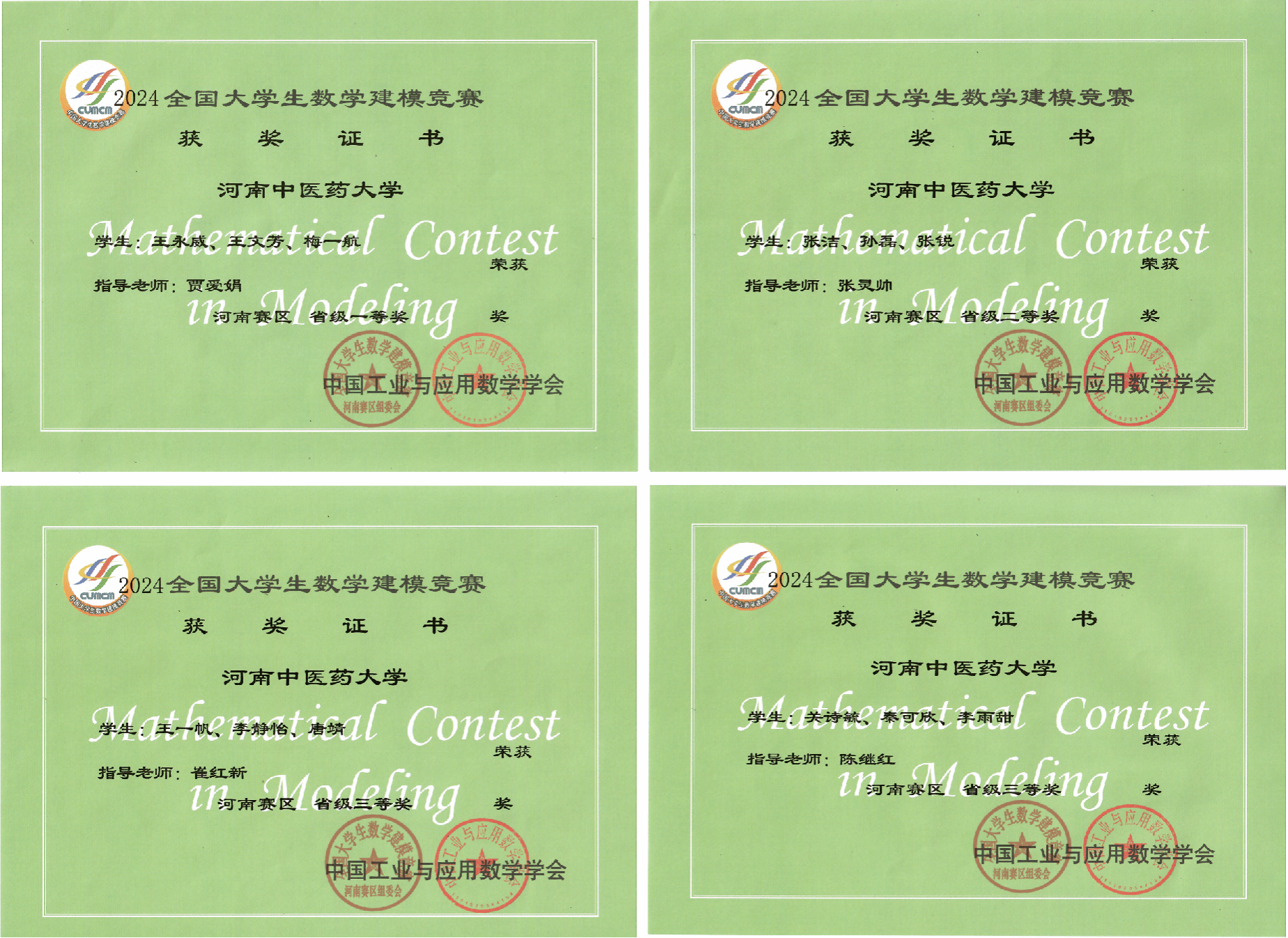 本网讯(文/图 黄琼)近日,2024年高教社杯全国大学生数学建模竞赛落下帷幕。*七猫小说 (中药制药技术与装备行业学院)数学与物理教研室教师首次组织学生参加高教社杯全国大学生数学建模竞赛,勇创佳绩。获得省级一等奖1项、二等奖1项、三等奖2项。