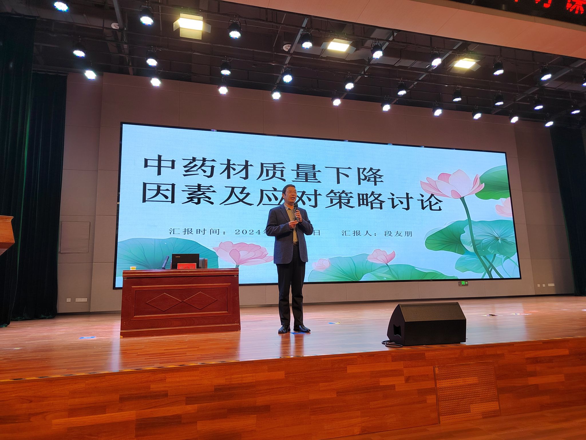 段友朋以“中药材质量下降因素及应对策略讨论”为题,从中药材在中医药中的核心作用及中药材质量现状出发,向同学们介绍了生长环境、种植环节、采收加工、流通储存等影响中药材质量的因素,并针对管理和人才等方面,介绍了应对中药材质量现状的策略与行动。并激励同学们要培养严谨的科学态度、提升自己的实践能力,将来在各自的岗位上为中药材质量的提升贡献力量。