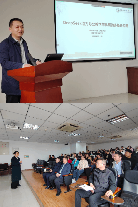 许玉龙博士围绕“DeepSeek助力办公教学与科研多场景应用”展开专题讲座。 他从DeepSeek发展历程、在高校办公、教学与科研的多场景应用、高效使用技巧、面临的挑战与思考等多方面进行分享。通过生动丰富的案例,理论结合实践,深入浅出地讲解了DeepSeek在办公自动化、教学资源整合、科研数据分析等方面的实际应用。为参会教师提供了清晰的思路和方法,引发了现场教师的强烈共鸣,激发了大家的学习热情。