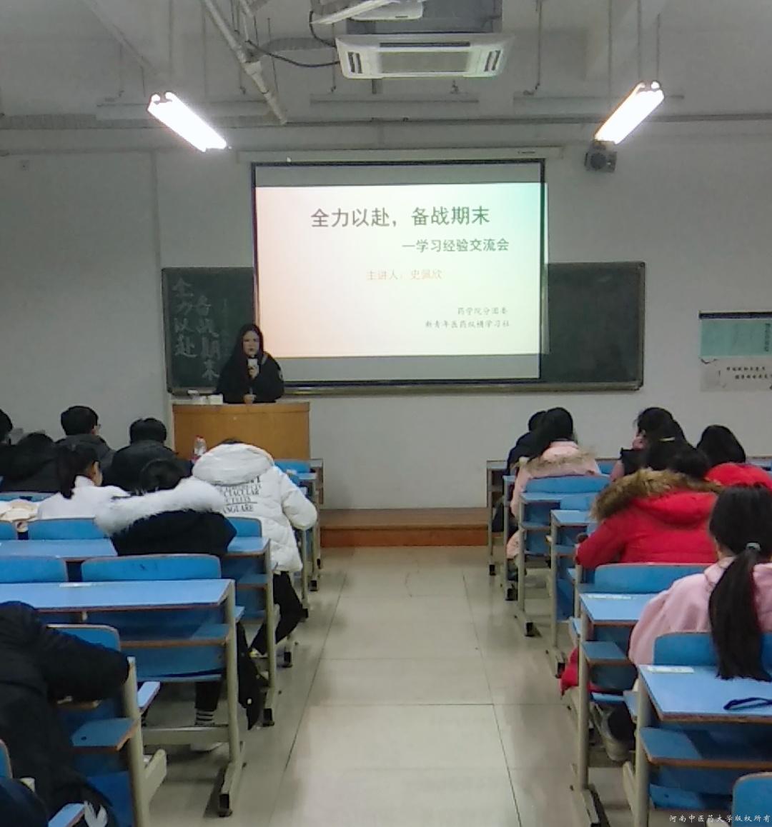为促进学院学风建设,号召同学们端正学习态度,2018年12月24晚,*七猫小说 新青年医药纵横学习社在教学楼A501教室举办了“全力以赴,备战期末”学习交流会,交流会邀请了国家奖学金获得者2015级药学班史佩欣参加。