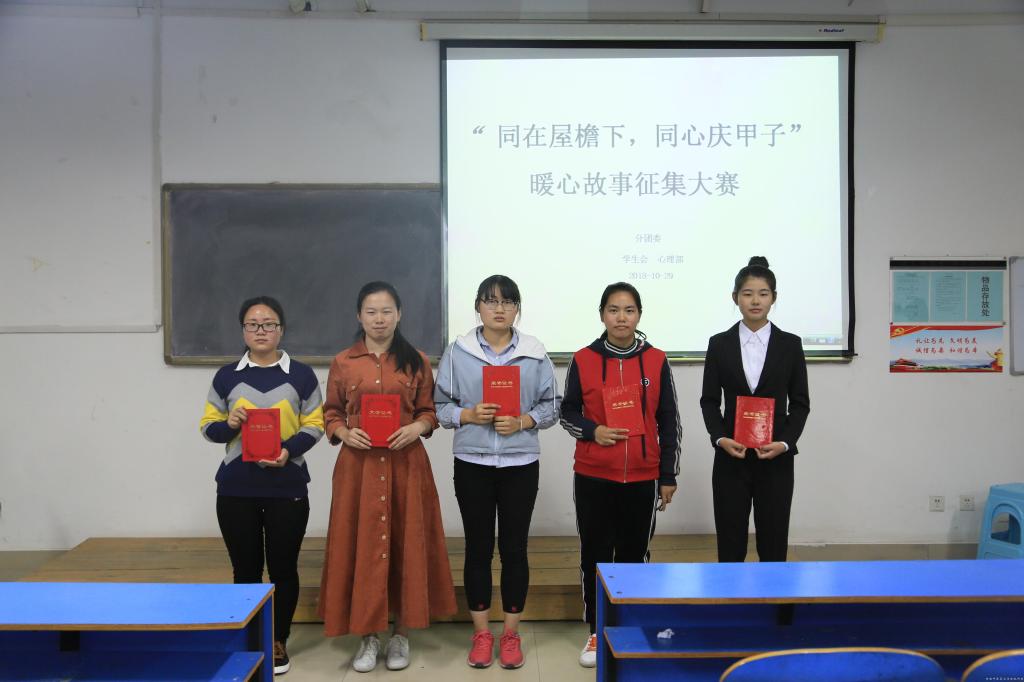 为配合七猫小说 心理健康活动宣传周的开展,营造和谐文明的宿舍环境,推动校园心理健康的发展,2018年10月29日,*七猫小说 分团委学生会心理部于教学楼A537教室举办了“同在屋檐下同心庆甲子”系列活动之宿舍暖心故事征集大赛决赛。