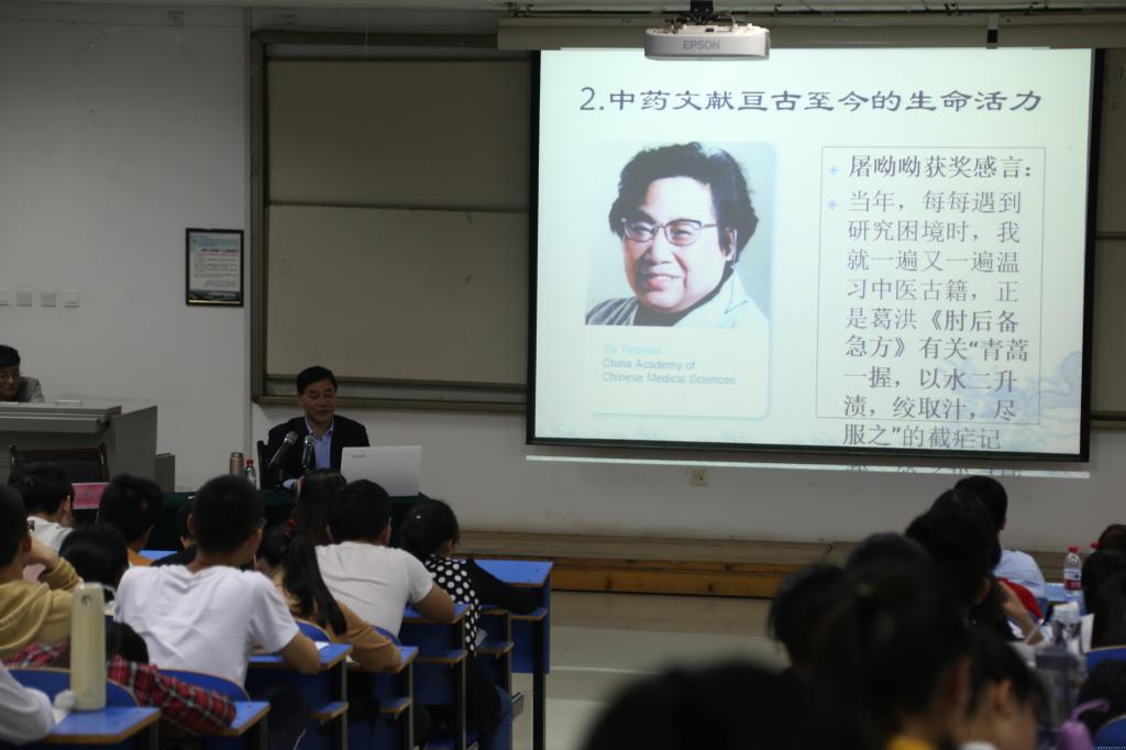 讲座上,崔瑛教授从中药文献浩如烟海、中药亘古至今的生命活力、中华文明的组成部分及载体、充分利用丰富的中药文献资源等四个方面进行讲解。首先,崔教授从中药文献入手,向同学们讲述了先贤们以及学术名家们是如何编纂和书写这些中药文献的,穿插的名医小故事也让整场讲座趣味恒生。中药文献纷繁复杂,中医药文化博大精深,崔教授以人参、茵陈蒿、郁金、蒲公英等中药为例讲述了目前学生所用教材《中药学》对《本经》、《新修本草》关于药材性味、功效、主治等的继承,也以屠呦呦从中药典籍中一步步发现青蒿素为例讲述了中药亘古至今的生命活力,更向大家展示了中医药文化和学术研究的魅力。中药文献是富饶的宝库,也是中华文化的重要组成部分和载体,从中药宝库中不仅能够给我们提供进步的阶梯,也能够为我们提供创新发展的思路,这也提示我们要充分利用丰富的中药文献资料,发掘优秀的文化资源。最后,崔教授也对在座师生提出了要求并寄予厚望,中医药文化是中国优秀传统文化,作为中医药大学的一份子,大家有责任也有义务去继承和发扬中医药文化,当下,同学们要做的就是打好专业基础,规划人生目标,承古拓新,为中医药文化的发扬光大贡献力量。