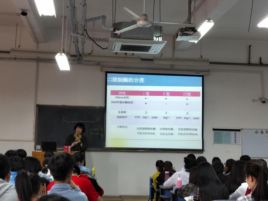 重组DNA技术,是20世纪70年代以后兴起的一门新技术,其主要原理是用人工的方法,把生物的遗传物质,通常是脱氧核糖核酸(DNA)分离出来,在体外进行基因切割、连接、重组、转移和表达的技术。以此为导入,郑晓珂教授引出了克隆、DNA克隆相关概念,借助图片展示了重组DNA的流程,让学生对DNA重组有了初步的了解,从而提出本堂课的目的要求,为学生明确指出本堂课需要掌握、熟悉以及了解的内容所在。在此基础上,郑教授按照重组DNA的流程,以“多利羊”为引,借助“多媒体+板书”的形式,重点讲述重组DNA技术中常用工具酶的分类、命名、活性以及应用等。她独特的循循善诱讲课风格和特有教学方法,深受学生喜爱和观摩者好评。