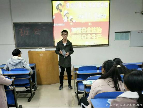 2017年11月10日--20日,2017级各班以消防安全知识为主题分别举行了班会,参加消防安全启动仪式的学生代表根据自己接受的培训,并结合查阅整理的消防安全资料,详细地向每一位同学讲解了火灾的危害及在学校、寝室和教室内需要注意的事项,做好防火防灾,有效的避免火灾的发生。为了进一步排除寝室内的安全隐患,各班班委也认真检查了寝室,防患于未然。