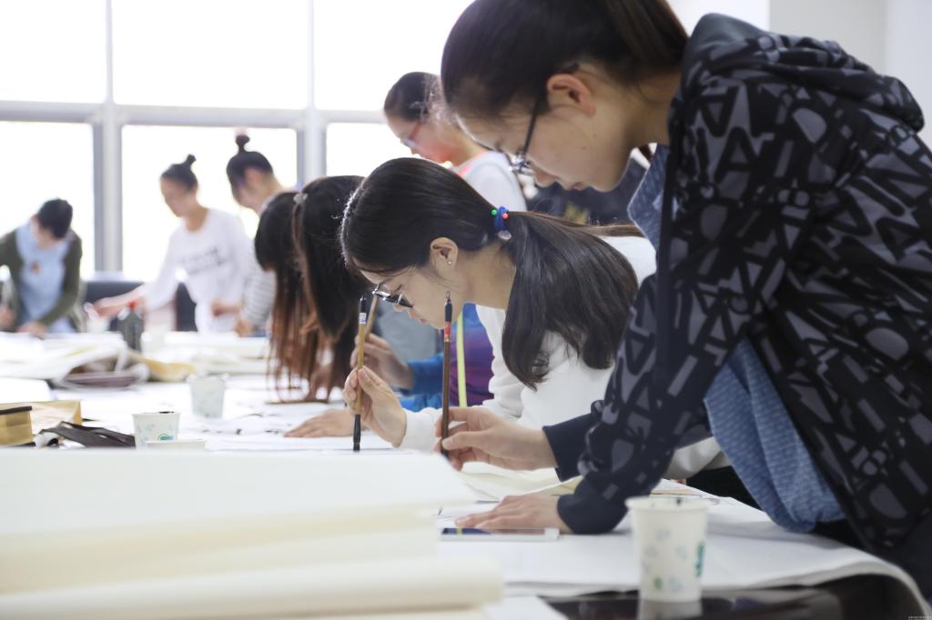 同学们按照楷书、隶书、行书、草书、篆书分成几个小组,分别由老师来指导。老骥伏枥,志在千里,老先生们用自己一生的书法经验教育学生,书法需要刻苦的练习,勤能补拙是良训,一分辛苦一分才。一份书法作品不只需要字写的好看,还需要掌握好布局,要有印章、要有落款、要留有天地、要掌握好字的排版和大小等等。交流会上,老师们对学生一一指导,这对学生们来说是平时不能接触到的,此次交流会显得异常珍贵难得。老师们不只留下了优秀作品,更是在每位学生的心中留下深刻的认知,书法需要静下心来,用心去写,只有这样,才能得到书法带来的快乐。