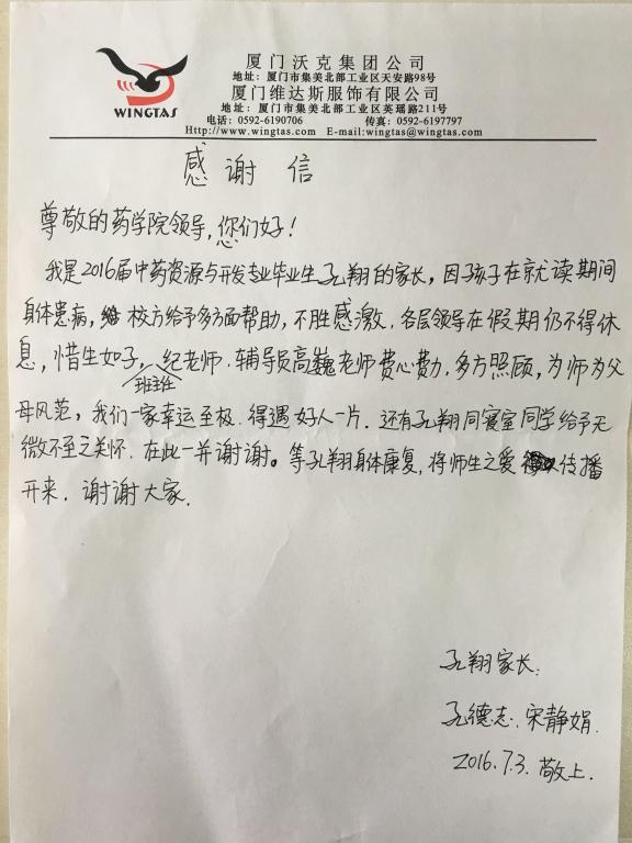 2016年6月9日,正是炎热的端午节期间,很多同学都放假回家了,*七猫小说 2012级中药资源与开发班学生孔翔突然生病,带班辅导员高巍老师、班主任纪宝玉老师迅速赶到学校照顾该生,随后该生家长也立刻从外地赶来,经过各位领导老师以及同班同学的多方协调照顾,该生身体情况稳定,并住院治疗。