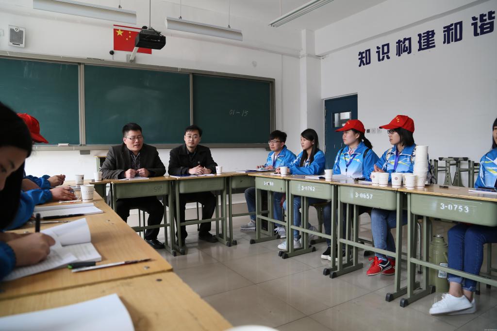 郑州七中教务处主任谷耀伟和志愿者们亲切交流