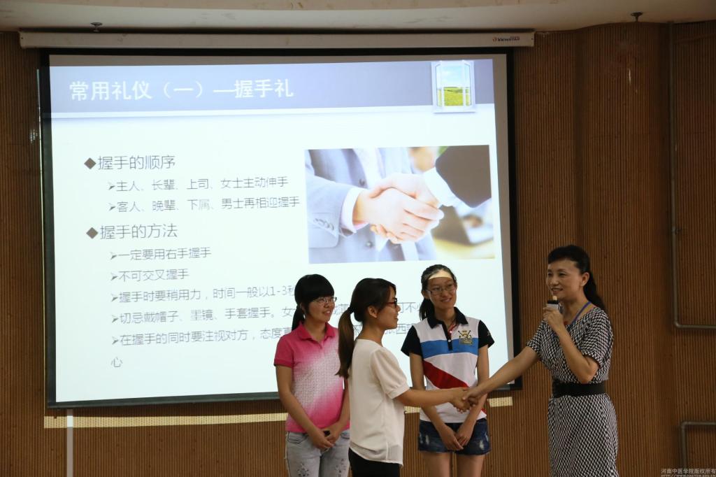 讲座伊始,张婉红老师就向在场师生论述了形象礼仪对于个人成长发展中的重要作用。张老师针对我院大学生文明礼仪规范进行了具体讲解。在不同场合需要的不同礼仪姿态,具体到站姿、行姿、坐姿、蹲姿等,并且亲自为同学们一一做出了详细示范。随后,张婉红老师还教给大家一些日常实用的社交礼仪,如常用礼貌用语,电话礼仪,点头握手礼仪等。讲座期间张老师以幽默的谈吐,鲜活的实例,富含知识性和趣味性的讲解带给了广大师生一场生动实用的礼仪盛宴,教室里响起一次次热烈掌声。