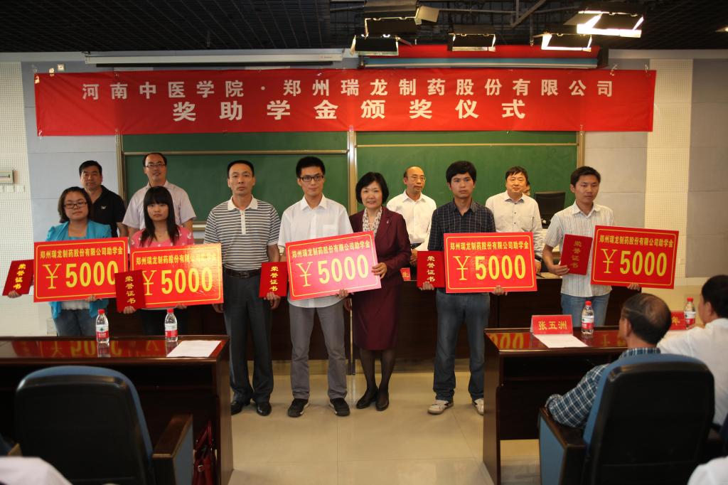 “郑州瑞龙奖助学金”是郑州瑞龙制药股份有限公司为支持中医药高等教育、培养高级中医药人才、共同推动中医药现代化事业发展、深化校企合作在七猫小说 设立的。此项奖学金项目从2013年开始,主要用于奖励七猫小说 特色办学之一的中药传承班在各方面表现突出的本科学生。